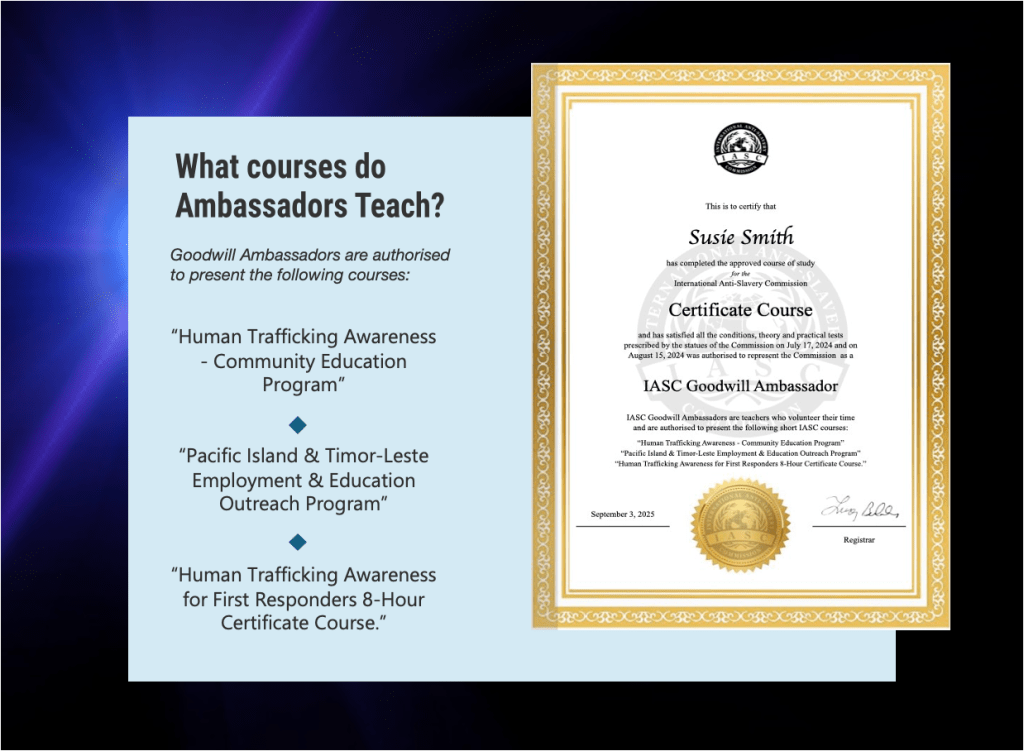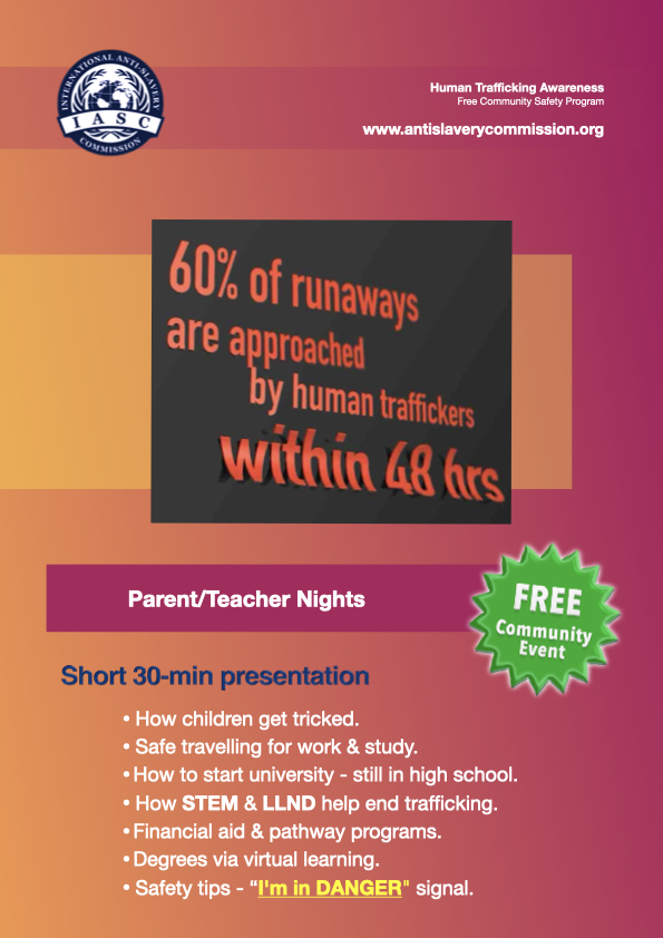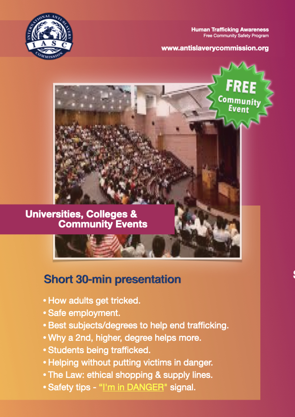 Human Trafficking Awareness: Free Community Education Program The International Anti-Slavery Commission provides free human trafficking education program to schools, colleges and universities. ← BackThank you for your response. ✨ First Name(required) Last Name(required) Job Title(required) Company Name, or Name of College, School, NGO or Community Group(required) Phone (Including Country and Area Code)(required) Email(required) Please suggest three appropriate dates(required) Are you enquiring about a visit to your group, or via Zoom? Comments or questions SubmitSubmitting form * Submission of this form does not guarantee our Ambassador’s availability. We will get back to you as soon as possible to answer your enquiry, and advise if your recommended dates are suitable, or suggestion other dates where one of our Ambassadors are in your area. Δ Download example program Share this: Share on X (Opens in new window) X Share on Facebook (Opens in new window) Facebook More Print (Opens in new window) Print Share on LinkedIn (Opens in new window) LinkedIn Share on Reddit (Opens in new window) Reddit Share on Tumblr (Opens in new window) Tumblr Share on Pinterest (Opens in new window) Pinterest Share on Telegram (Opens in new window) Telegram Share on Threads (Opens in new window) Threads Share on WhatsApp (Opens in new window) WhatsApp Share on Mastodon (Opens in new window) Mastodon Share on Nextdoor (Opens in new window) Nextdoor Share on X (Opens in new window) X Share on Bluesky (Opens in new window) Bluesky Like this:Like Loading...